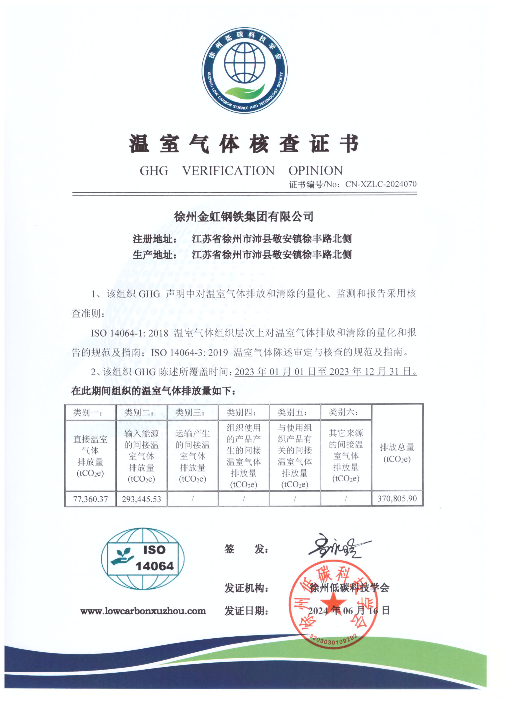 公示:金虹鋼鐵集團溫室氣體核查證書
